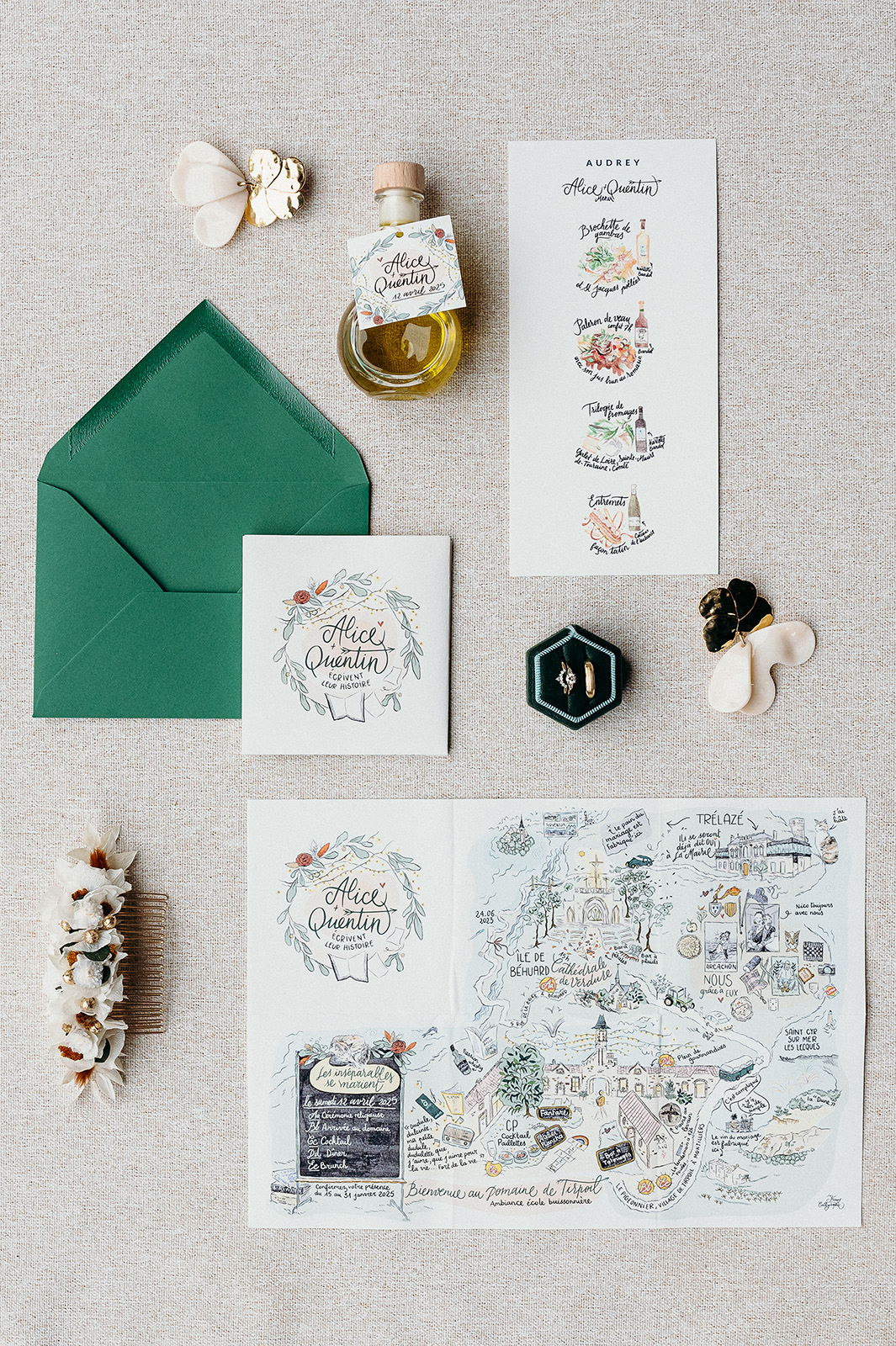 " Suite à la réception de notre faire-part, nous étions subjugués. C’est du grand art. L’ambiance est là, la richesse des petits détails de nos vies, des petites pointes d’humour… et j’en passe… D’ailleurs ça se ressent dans les réactions de nos proches. Beaucoup, pour ne pas dire tous, nous répondent que le faire-part est génialissime. Plusieurs ont souhaité l’avoir non plié pour pouvoir l’encadrer… Quoi de mieux que ce faire part, pour nous et nos convives, pour se plonger dans l’imaginaire de notre mariage. Encore une fois, un grand merci à toi pour la réussite de ce magnifique faire-part au-delà sincèrement de nos espérances. " - Mathilde & Adrien