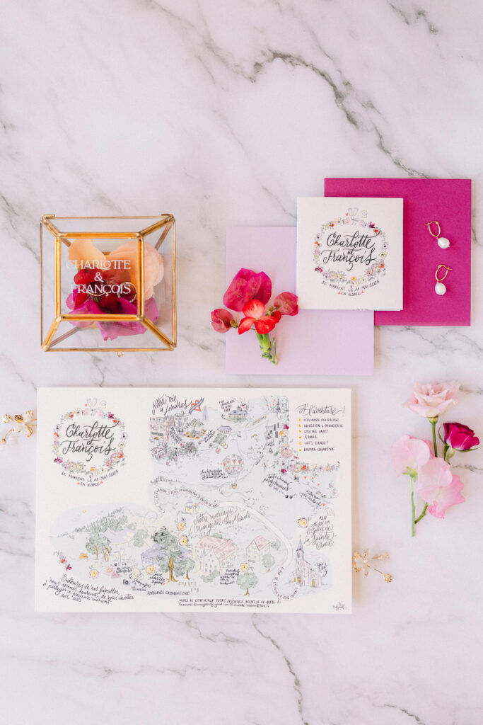 Après avoir créé votre faire-part personnalisé, on peut décliner votre univers sur le reste de votre papeterie de mariage et familiale
